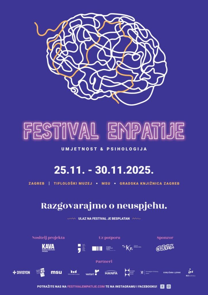 pozivamo Vas na Festival empatije 2025., interdisciplinarni projekt koji spaja umjetnost, psihologiju i inkluziju te potiče zajednicu na razumijevanje različitih životnih iskustava. Molimo da poziv proslijedite ravnatelju/ici škole.
