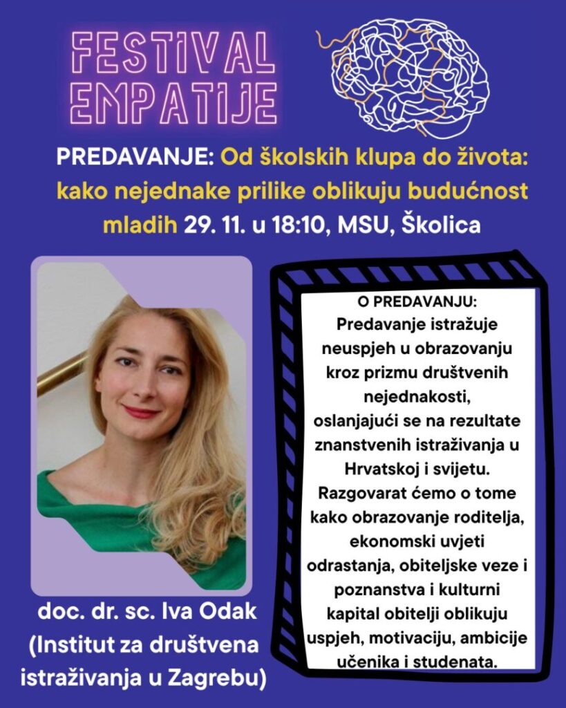 29. 11., 18:10-19:10 Od školskih klupa do života: kako nejednake prilike oblikuju budućnost mladih (Iva Odak iz Instituta za društvena