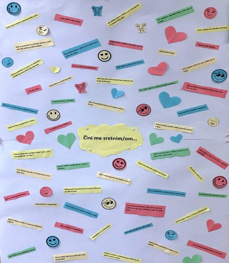 Učenici 1. a, 3. a, 3. e. i 3. f razreda dobili su zadatak razmisliti o tome što ih čini sretnima, s tim da su u odgovorima trebali biti što kreativniji, zanimljiviji, duhovitiji, originalniji. Bilo je tu svakojakih odgovora – od onih općih da ih čini sretnima ples, ispijanje kave na suncu, druženje s prijateljima, preko onih „školskih“ kao što su trenutci kada saznaju da neće imati zadnji sat, kad dobiju dovoljan iz matematike i kad im se odgodi test, do onih kao što su biti prvi u redu u pekarnici preko puta škole, kad nađu u džepu 10 eura na koje su zaboravili ili kad ih dočeka doma jelo koje vole. Učenici su svoje odgovore složili na plakat te ga ukrasili emojijima. (Pogledajte plakat u školskom predvorju i pročitajte ostale zanimljive odgovore.)