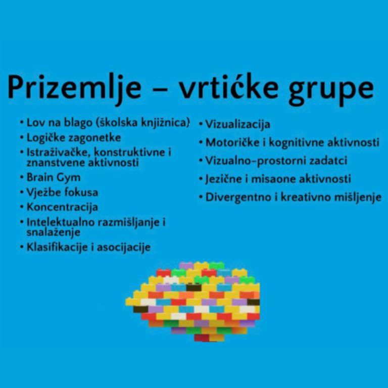 U predvorju škole i u učionicama odvijale su se razne aktivnosti koje su uključivale i poticale različite misaone i kognitivne procese, divergentno i kreativno mišljenje, intelektualno razmišljanje i snalaženje te percepciju osjeta. Učenici su osmislili razne zadatke kojima se vježbala koncentracija, pažnja, vizualizacija i metakognicija. Provodili su različite logičke i matematiče izazove, istraživačke, konstruktivne, znanstvene kao i motoričke aktivnosti. Igrale su se jezične i verbalne igre, igre klasifikacija i asocijacija , a za one jako „ozbiljne“ bilo je i logičkih te strateških izazova. Kroz sve te aktivnosti, zadatke i izazove, učenici i djeca predškolskog uzrasta stimulirali su rad mozga, osvijestili su važnost organa kao što je mozak, te su upoznali njegove različite funkcije i uloge.