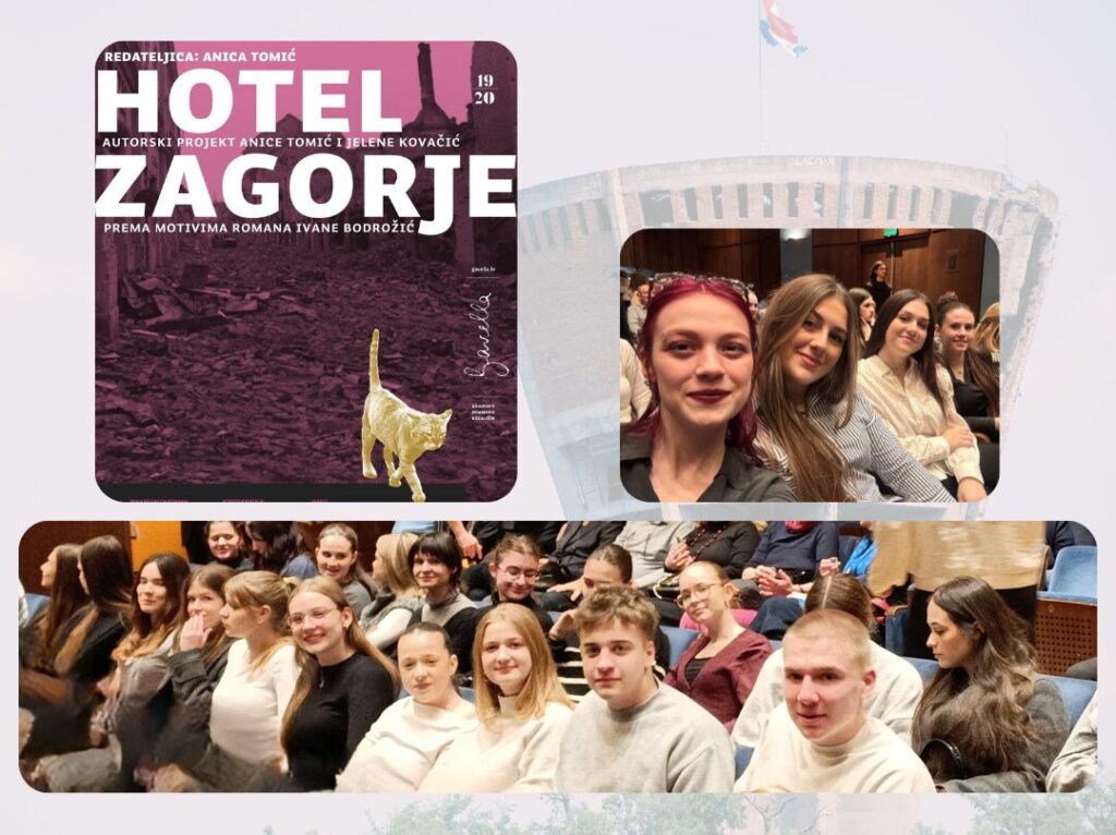 U srijedu, 4. veljače, trideset učenika 3. a, 4. b i 4. d pogledalo je u Dramskom kazalištu Gavella predstavu „Hotel Zagorje“. Učenike su pratile nastavnice povijesti Mirela Balešić Jović, prof. i Lidija Dumančić, prof., te ravnateljica Sonja Kamčev Bačani, prof.