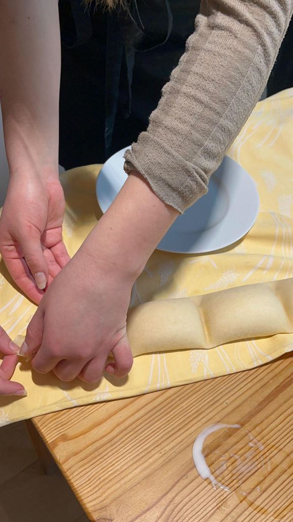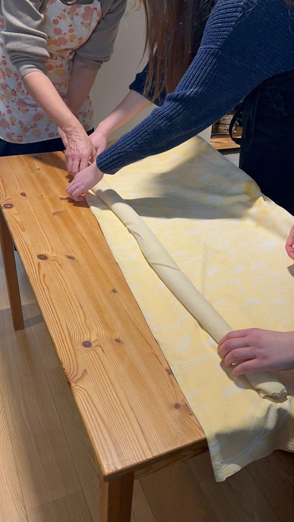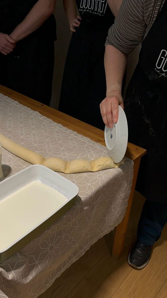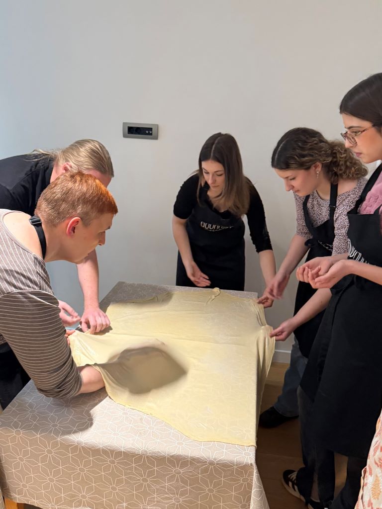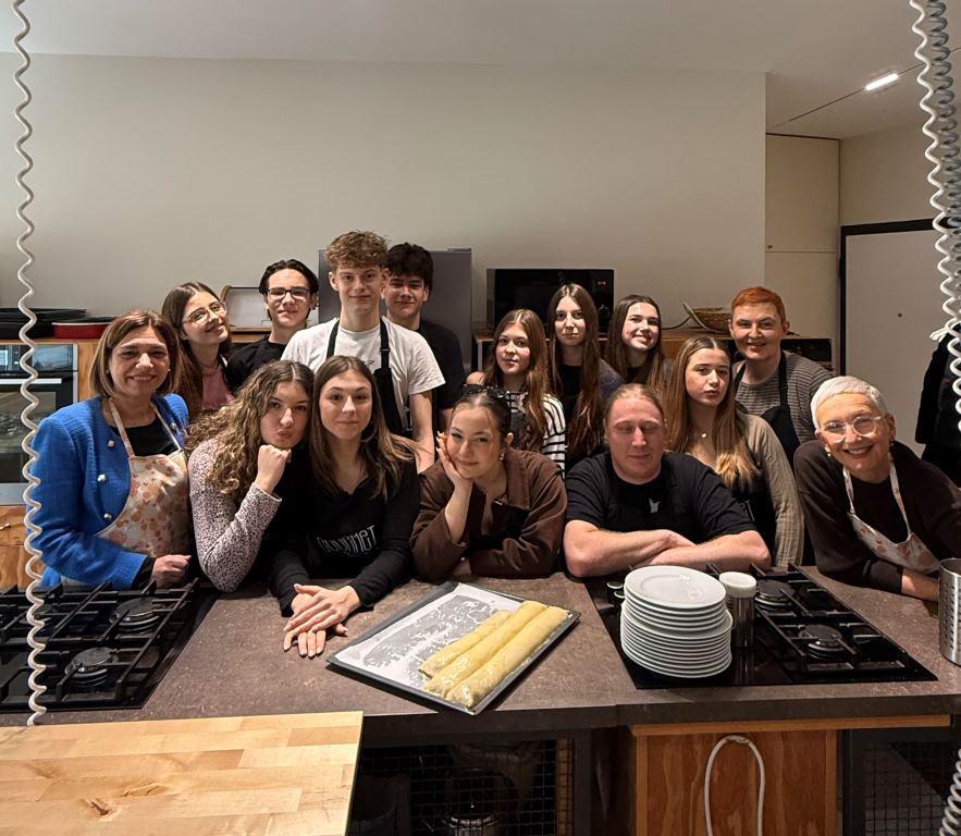 Nakon razgleda uputili smo se u kulinarski studio gdje je održana radionica pripreme tradicionalnih štrukli. Učenici su radili u skupinama za tri radna stola te su sudjelovali u svim fazama pripreme – od valjanja i razvlačenja tijesta, izrade nadjeva do rolanja i oblikovanja štrukli. Dok su se štrukli pekli u pećnici, učenici su dodatno pripremali savijače od jabuka, čime su ispunili vrijeme pečenja i proširili svoje kulinarsko iskustvo.