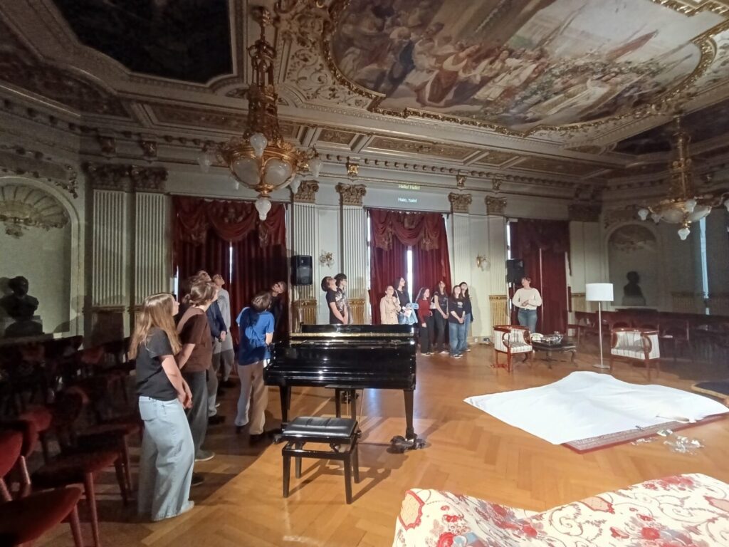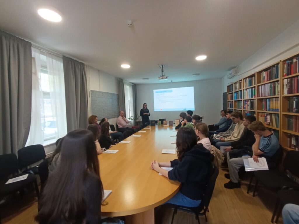 Posjetili smo Institut za hrvatski jezik gdje su nas ugostili: ravnatelj dr. sc. Željko Jozić, dr. sc. Kristian Lewis, dr. sc. Sanja Perić Gavrančić, dr. sc. Maja Matijević i doktorandica Dorotea Cakić. Imali smo priliku upoznati povijest i djelatnost Instituta, saznati kako nastaje rječnik od odabira riječi, obrade pa sve do uređivanja i objave, poslušati zašto su Jakov Mikalja, Faust Vrančić i Bartol Kašić važni za hrvatsku jezičnu povijest, a predstavljeni su nam i digitalni alati kojima možemo poboljšati svoje poznavanje hrvatskog standardnog jezika.